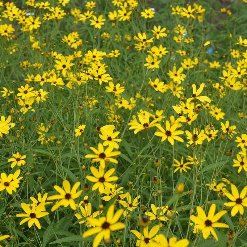 The late summer/fall garden is all about big and tall, and ‘Gold Standard’ Tickseed (Coreopsis tripteris ‘Gold Standard’) fits right in with towering stems covered with large bright yellow daisies for several months beginning in late summer. This cultivar was selected by the prestigious Mt. Cuba Center botanic garden of Delaware for its outstanding, strongly upright growth habit and extended bloom time. Vigorous and easy-to-grow Coreopsis ‘Gold Standard’ loves the sun and grows readily in a wide range of soils including clay. The plant attracts butterflies when blooming and seed-eating songbirds in the fall when the seed ripens. Planted with other tall, late-season blooming perennials such as Joe Pye Weed (Eupatorium), Maximilian’s Sunflower (Helianthus), Prairie Switchgrass (Panicum) and Big Blue Stem Grass (Andropogon). These natives provide a stunning conclusion to the growing season and much needed nectar to many different pollinators.